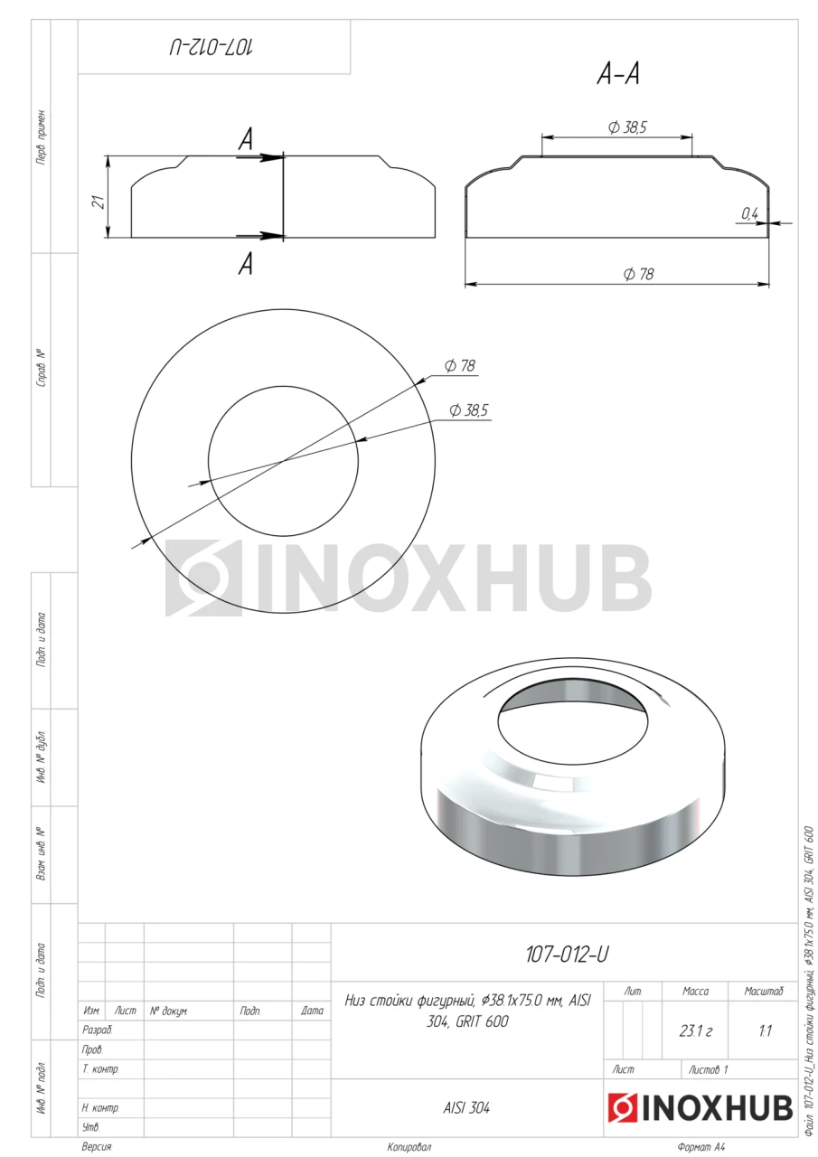 Низ стойки фигурный, Ø38.1×75.0 мм, AISI 304, GRIT 600