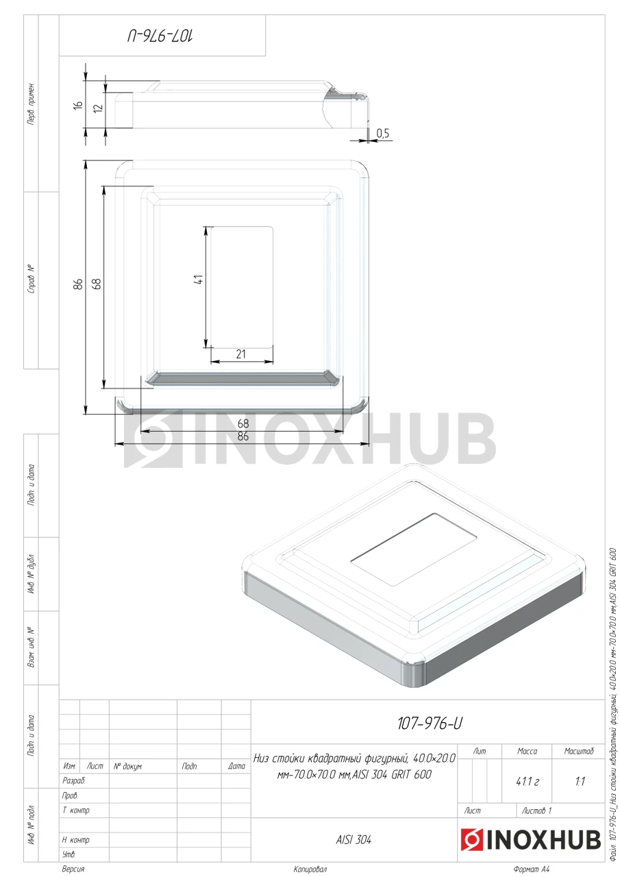 Низ стойки квадратный фигурный, 40.0×20.0 мм / 70.0×70.0 мм, AISI 304, GRIT 600