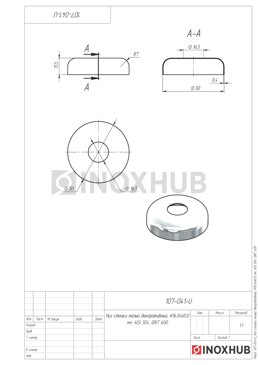 Низ стойки малый декоративный, Ø16.0×60.0 мм, AISI 304, GRIT 600
