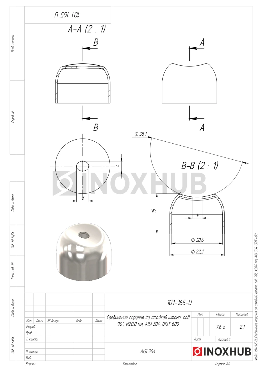 Соединение поручня со стойкой штамп. под 90°, Ø20.0 мм, AISI 304, GRIT 600