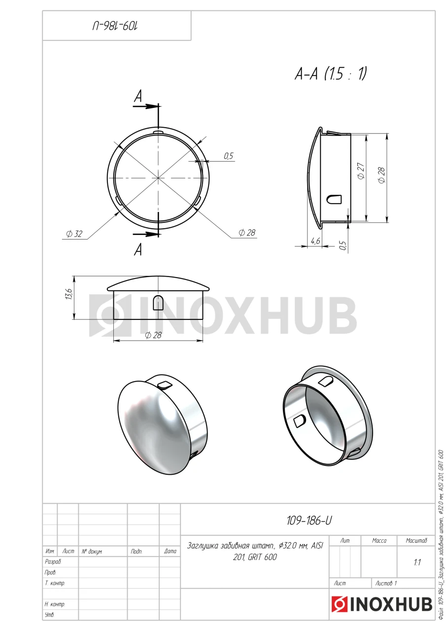 Штампованная забивная заглушка для труб диаметром 32 мм изготовлена из нержавеющей стали AISI 201. Подходит для установки исключительно в помещении. Деталь имеет глянцевую полированную поверхность — GRIT 600.