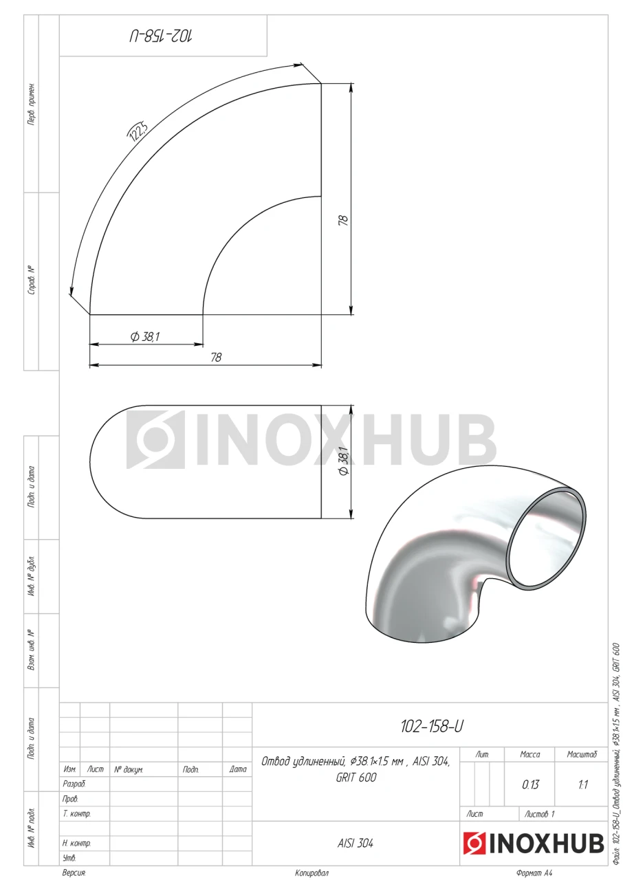 Отвод удлиненный, Ø38.1×1.5 мм, AISI 304, GRIT 600