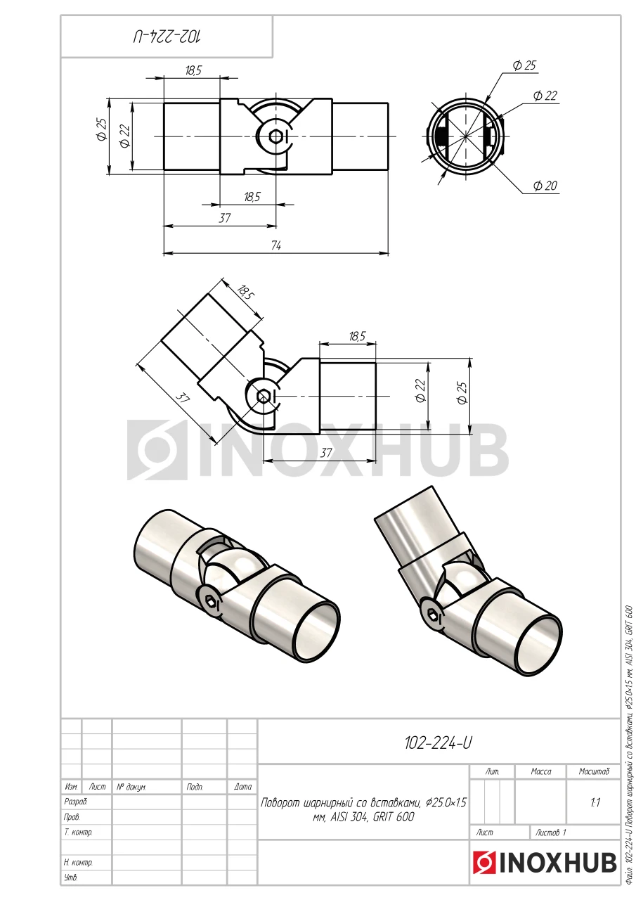 Поворот шарнирный со вставками, Ø25.0×1.5 мм, AISI 304, GRIT 600