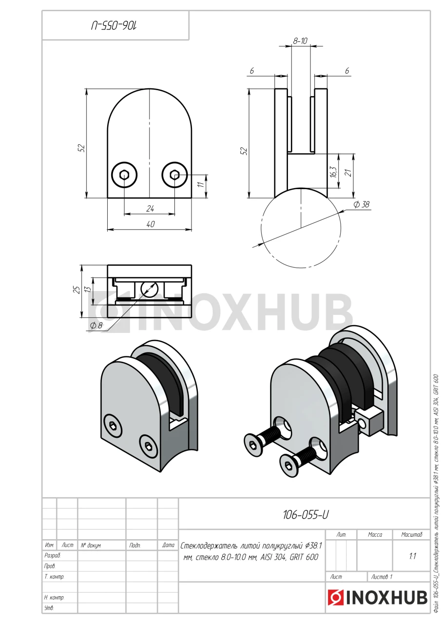 Стеклодержатель литой полукруглый Ø38.1 мм, стекло 8.0-10.0 мм, AISI 304, GRIT 600 в продаже. Оперативная доставка со склада в Москве. Все товары соответствуют стандартам качества.