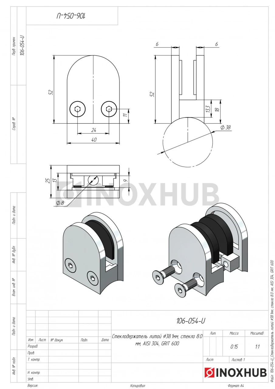 Стеклодержатель литой полукруглый Ø38.1 мм, стекло 8.0 мм, AISI 304, GRIT 600