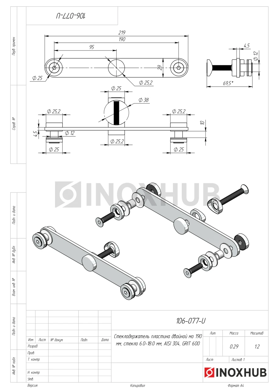 Стеклодержатель типа пластина для стекол толщиной 6-18 мм изготовлен из прочной стали марки AISI 304. Деталь комплектуется втулками, прокладками, декоративными гайками, прижимными декоративными шайбами, винтами. Держатель подходит для установки на улице, в условиях с переменной влажностью. Пластина и некоторые элементы комплекта крепления имеют полированную поверхность GRIT 600.