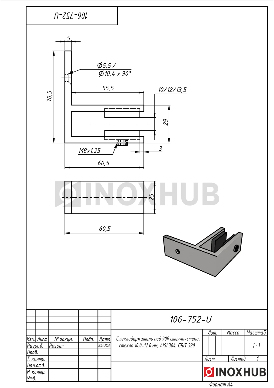 Стеклодержатель под 90º стекло-стена, стекло 10.0-12.0 мм, AISI 304, GRIT 320