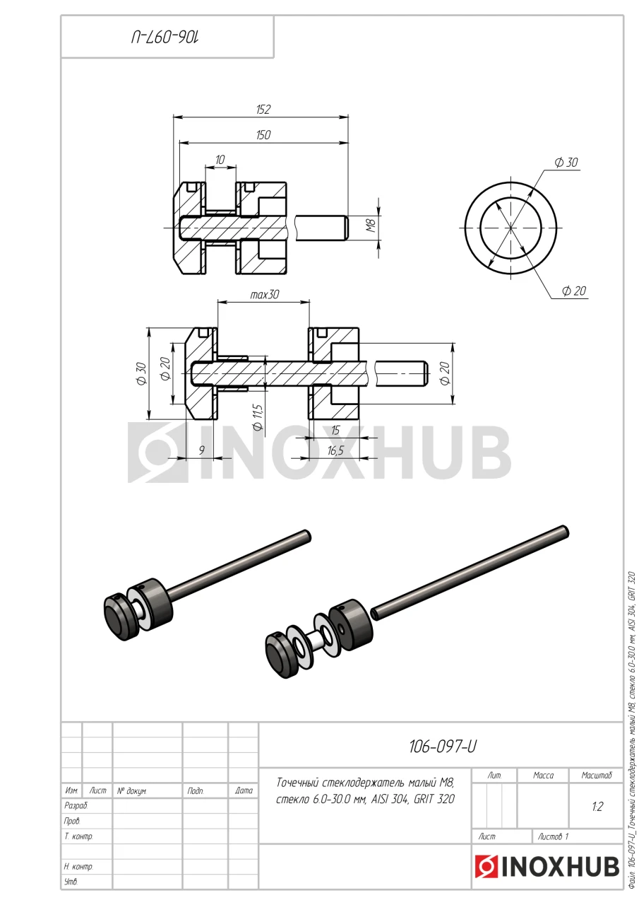 Точечный облегченный стеклодержатель с размером шпильки М8 подходит для стекол толщиной 6-22 мм. Шпилька и шайбы изготовлены из стали марки AISI 304, поэтому их можно эксплуатировать на улице. Длина шпильки — 200 мм, диаметр шайб — 30 мм. Поверхность шлифованная GRIT 320.
