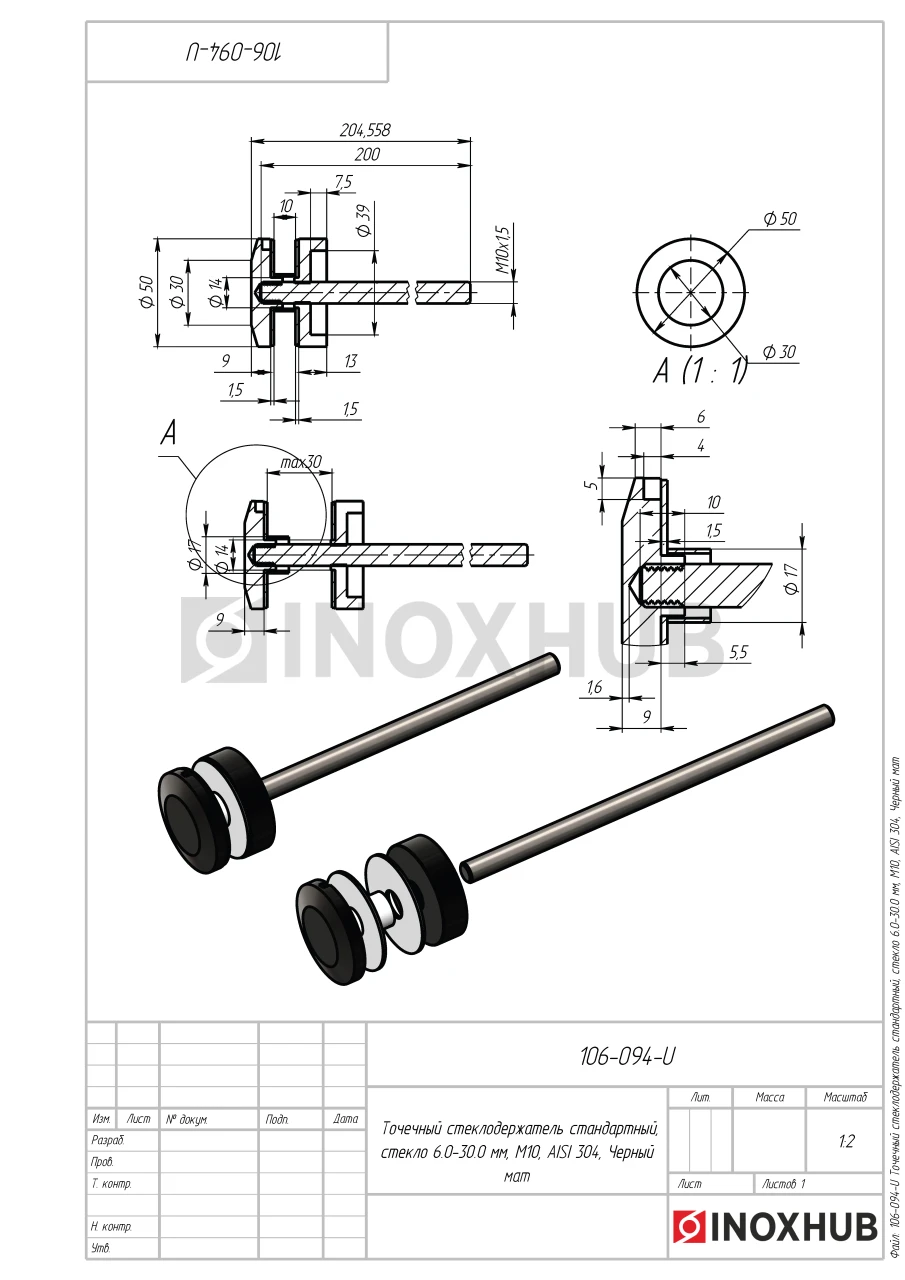 Точечный стеклодержатель с размером шпильки М10 подходит для стекол толщиной 6-30 мм. Шайбы изготовлены из стали марки AISI 304, поэтому деталь можно эксплуатировать на улице. Длинная оцинкованная шпилька выдерживает большую массу стекла. Длина шпильки — 200 мм, диаметр шайб — 50 мм. Черное матовое покрытие.