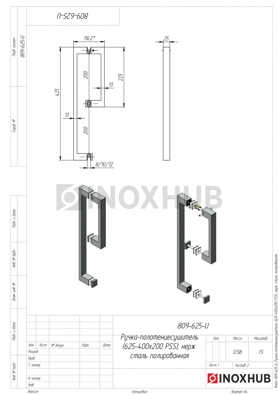 Ручка-полотенцесушитель (625-400х200 PSS), 25х13 400х200, нерж. сталь полированная