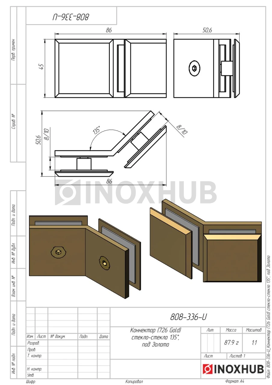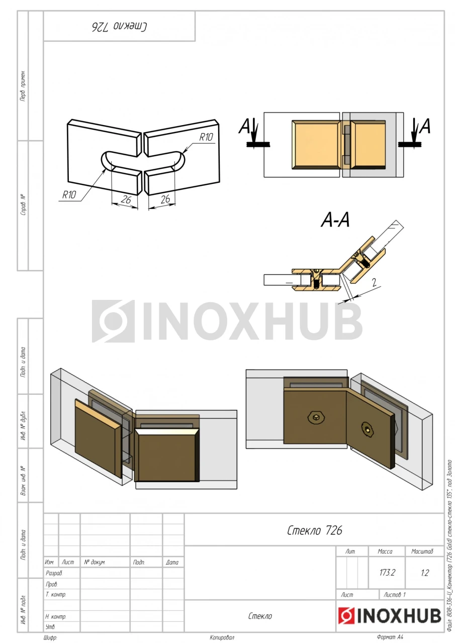 Коннектор (726 Gold) стекло-стекло 135°, под Золото