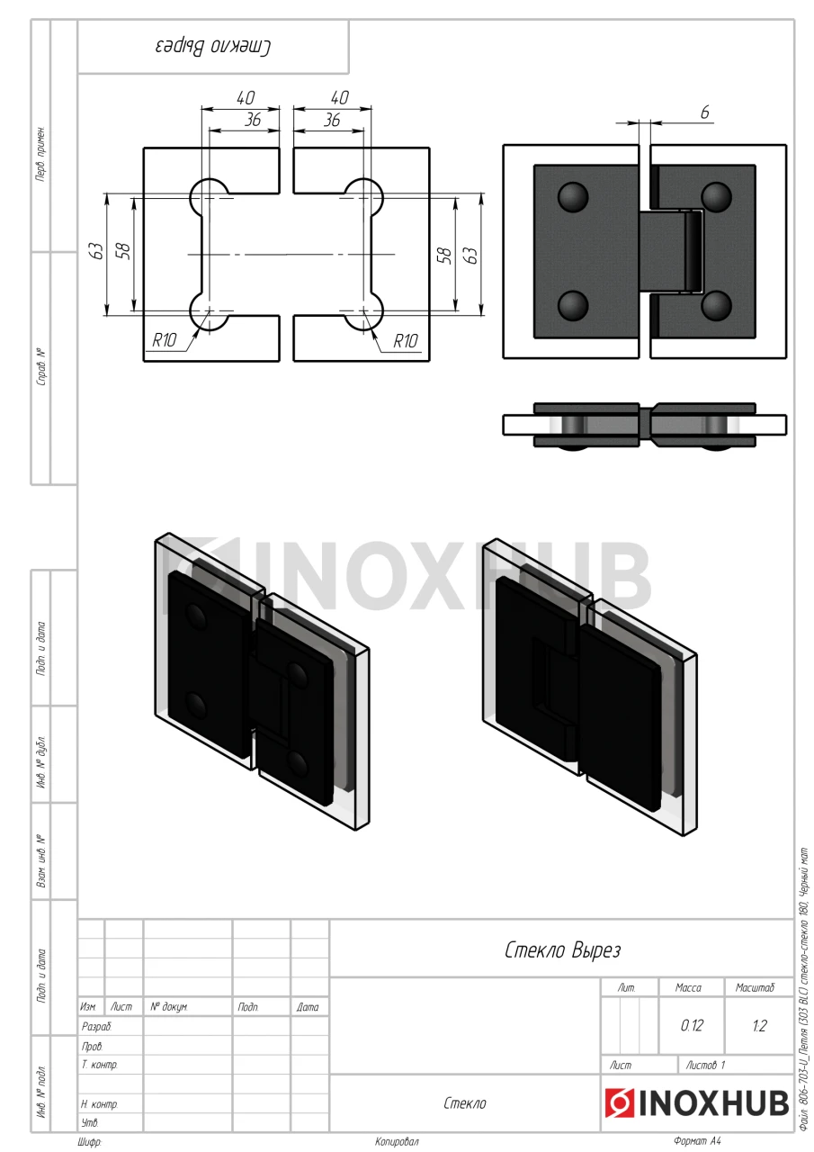 Сборка и монтаж. Перед установкой необходимо подготовить стекло и собрать петлю согласно чертежам и схемам. В комплекте поставляются прокладки для прочной фиксации стеклопанели. Стекло зажимается между пластинами петли, которые соединяются двумя шестигранными болтами с каждой стороны. В конструкции заложена система скрытого крепежа.