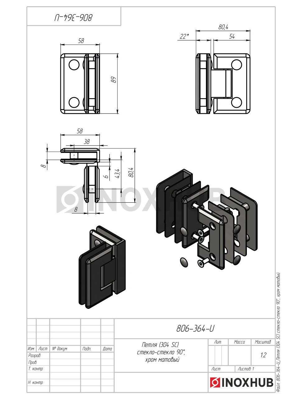 Петля (304 SC) стекло-стекло 90°, матовый хром