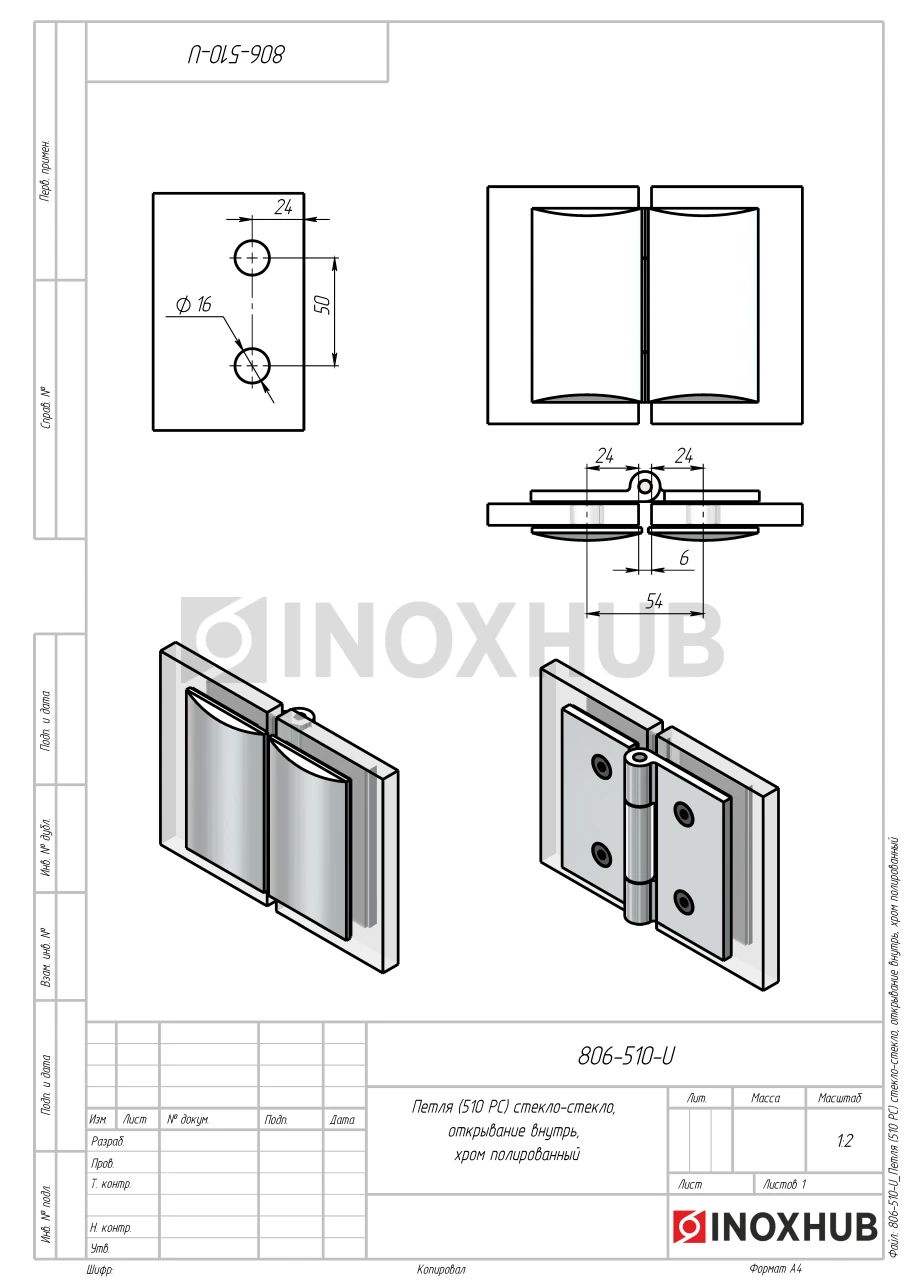 Петля (510 PC) стекло-стекло, открывание внутрь, полированный хром