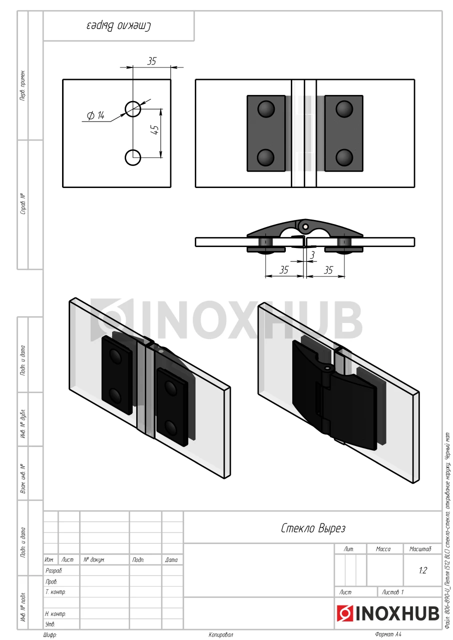 Сборка и монтаж. Подготовьте отверстия в стекле и двери согласно чертежу. Петля не требует реза уплотнителя, все крепежные элементы поставляются в комплекте. Модель устанавливается на шестигранные винты.