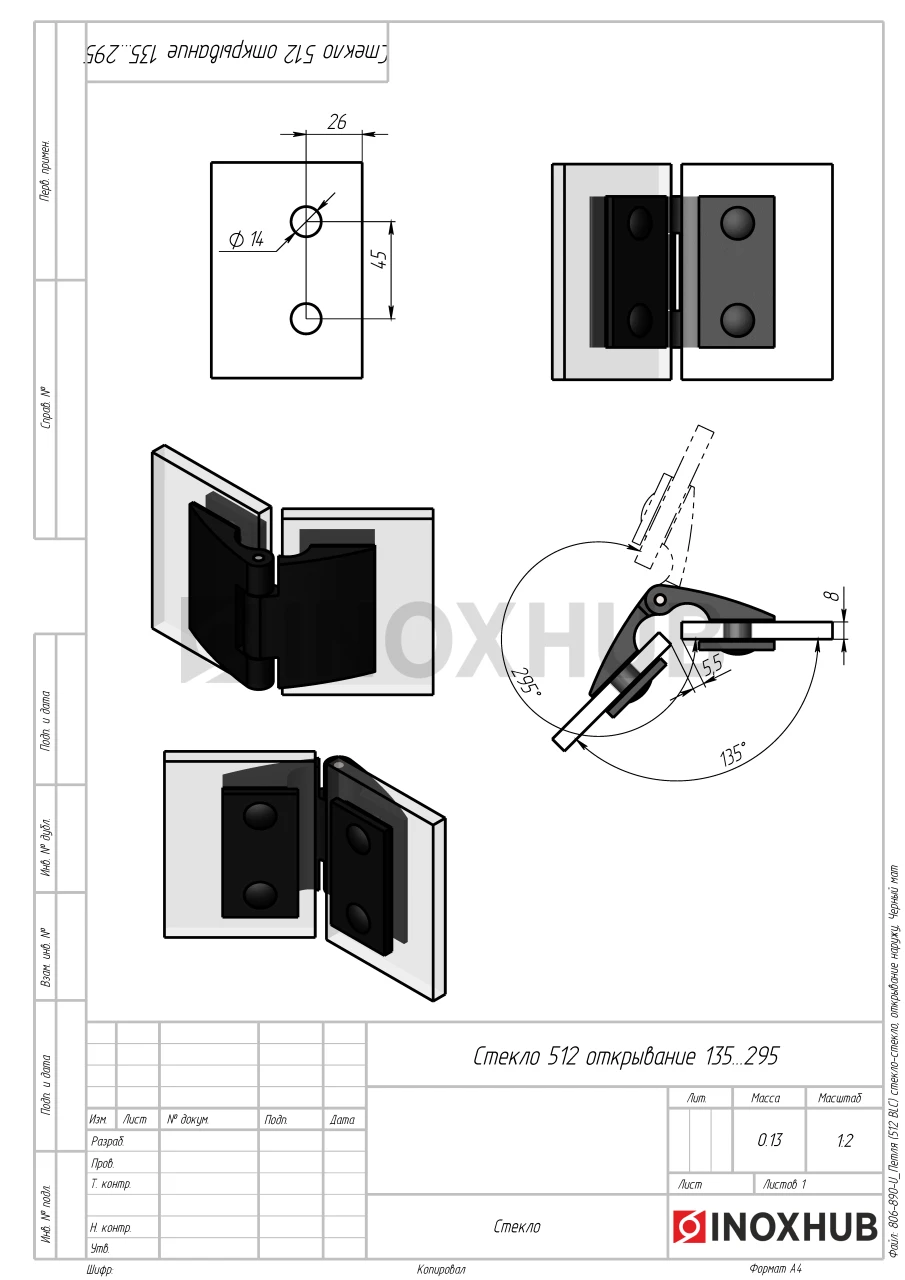 Применение. Петля используется для крепления стеклянной двери душевой кабины или перегородки. Элемент обеспечивает открывание на 90° наружу. Монтаж производится на стационарное стекло в одной плоскости с дверью. Модель подходит для стекол шириной 8 мм. Рекомендуемая ширина полотна — 600 мм при весе двери 30 кг на обе петли.
