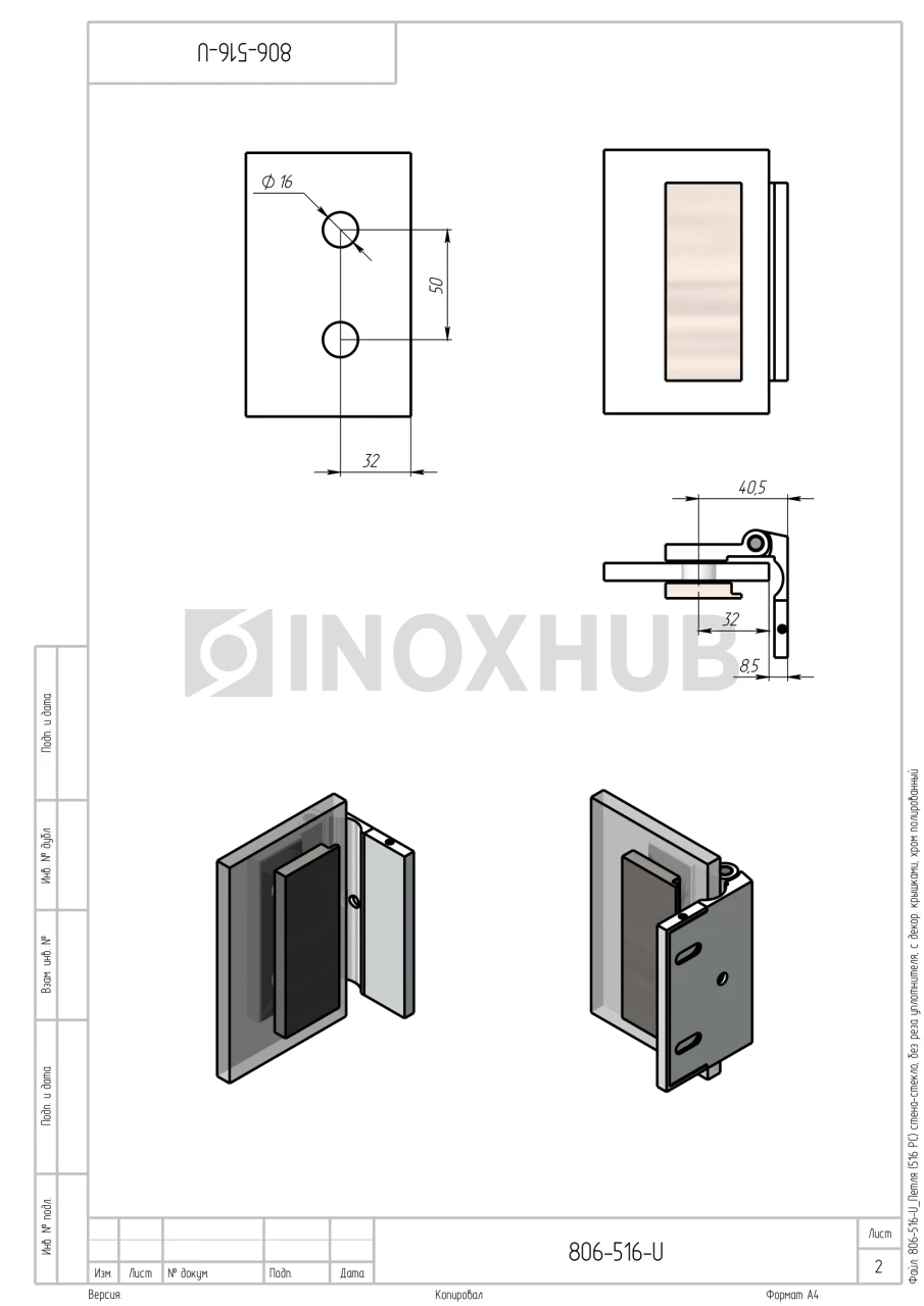 Применение. Модель используется для монтажа стеклянной двери к стене под углом 90°. Толщина стеклопанели — 8 мм, рекомендуемый вес дверного полотна на обе петли — до 30 кг, ширина двери — до 600 мм. Модель подходит для стандартных душевых кабин, а также дверных систем типа «гармошка». Петля обеспечивает открытие двери в одну сторону. Декоративные крышки прикрывают винты, придавая механизму более эстетичный и завершенный вид.