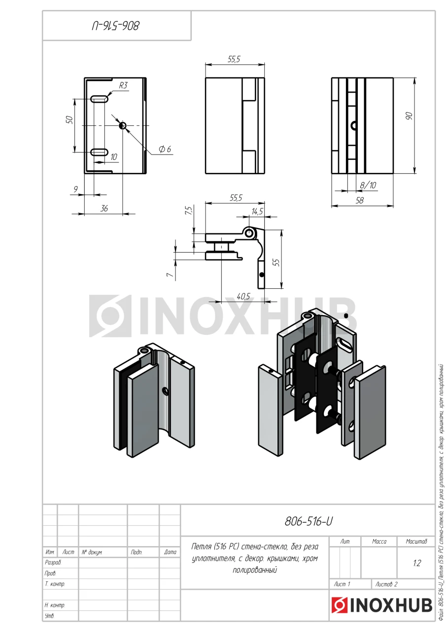Петля (516 PC) стена-стекло, без реза уплотнителя, с декоративными крышками, полированный хром