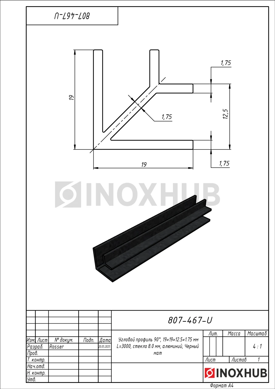 Угловой профиль 90°, 19×19×12.5×1.75 мм L=3000, стекло 8.0 мм, алюминий, Черный мат