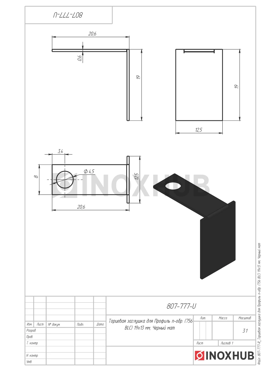 Торцевая заглушка для Профиль п-обр. (756 BLC), 19×13 мм, Черный мат