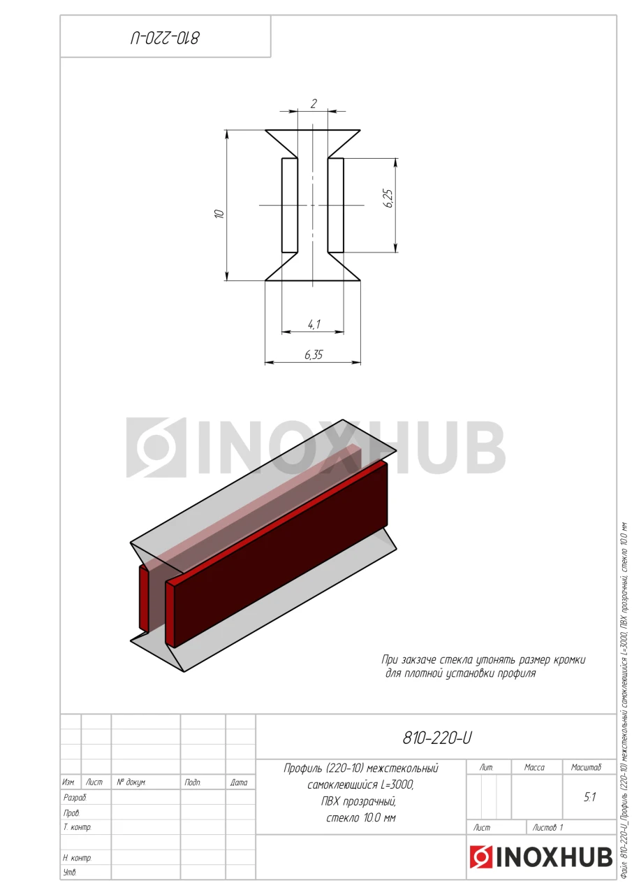 Профиль (220-10) межстекольный самоклеящийся, L=3000, стекло 10.0 мм, ПВХ прозрачный
