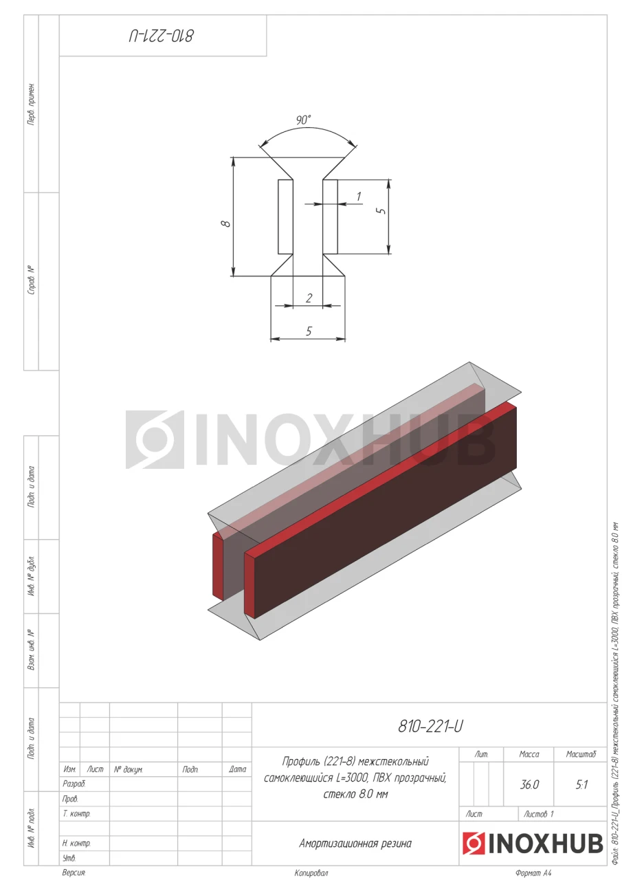 Профиль (220-8) межстекольный самоклеящийся, L=3000, стекло 8.0 мм, ПВХ прозрачный