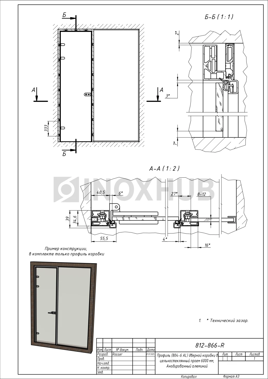 Профиль (804-6 AL) дверной коробки в цельностеклянный проем 6000 мм, Анодированный алюминий