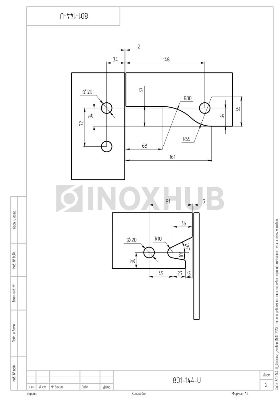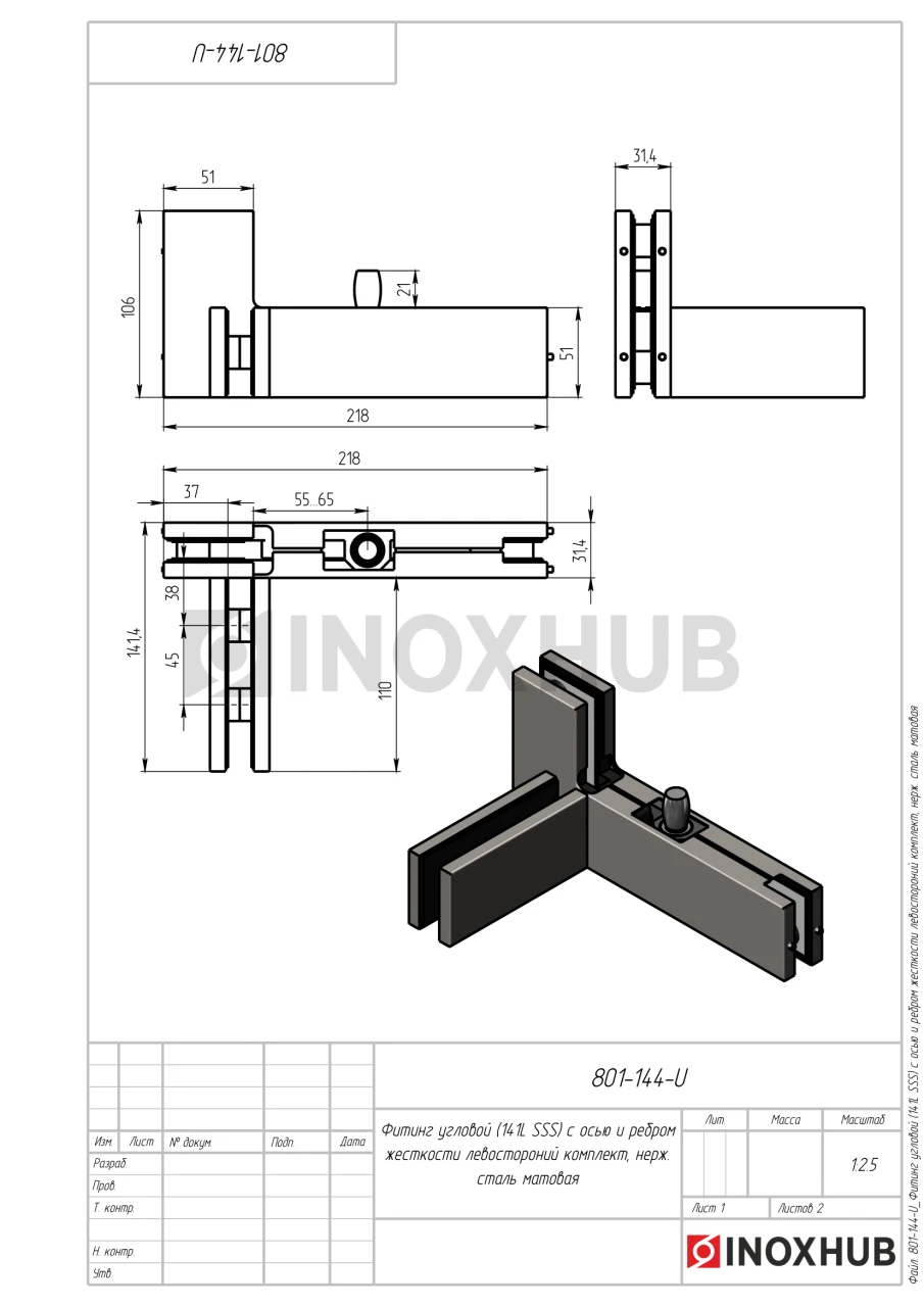 Фитинг угловой (141L SSS) с осью и ребром жесткости, левостороний комплект, нерж. сталь матовая