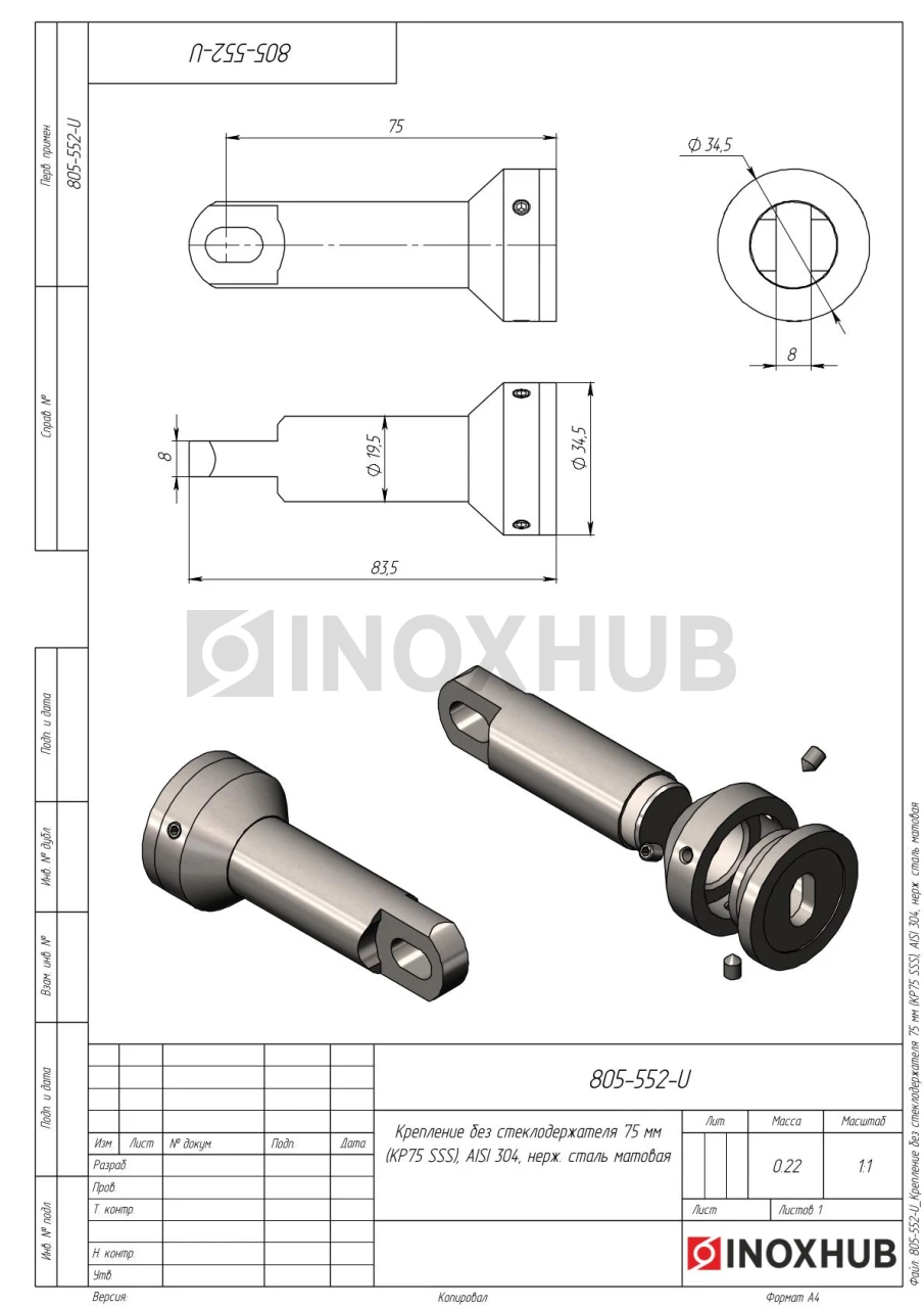 Крепление без стеклодержателя 75 мм (203-75 SSS), AISI 304, нерж. сталь матовая