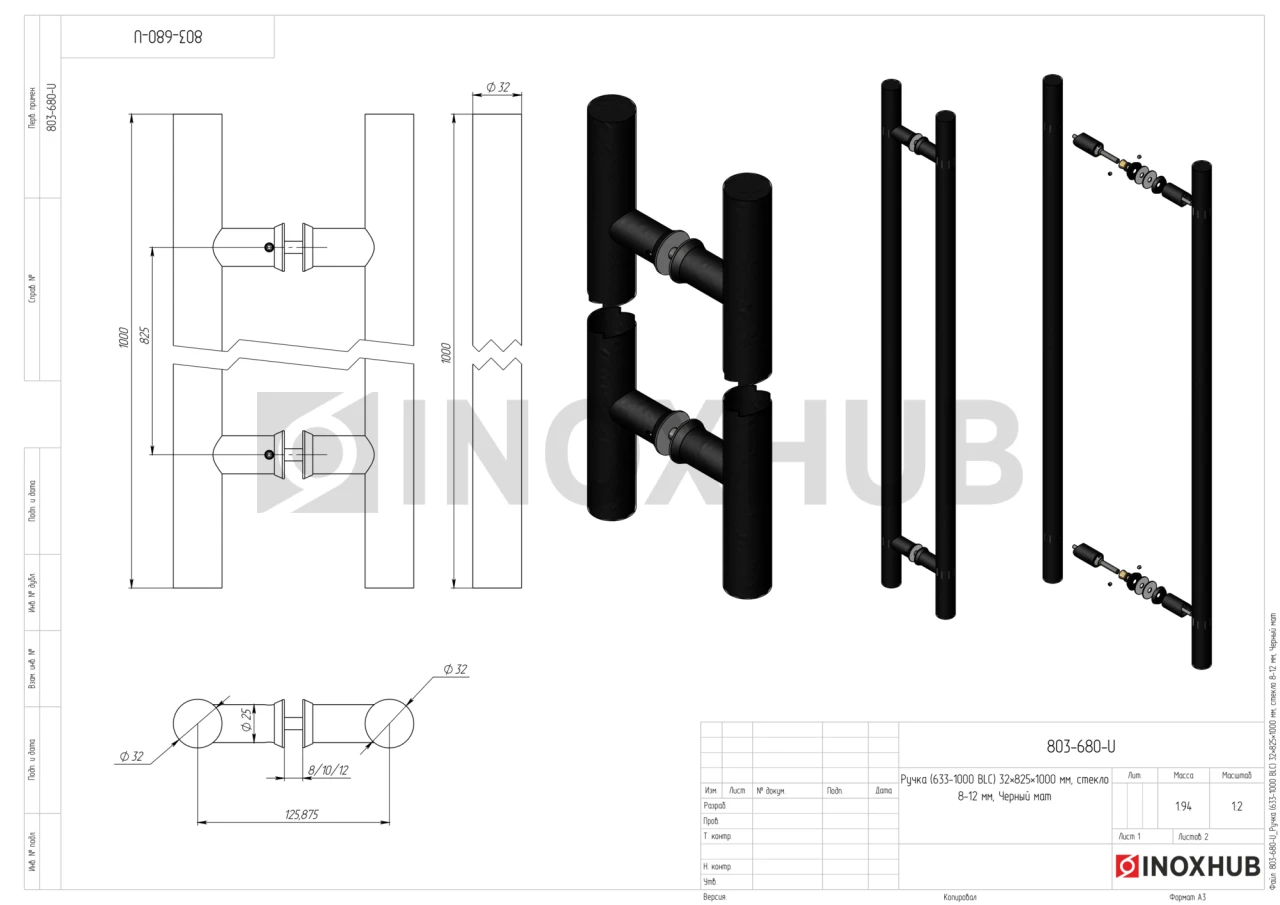 Ручка (633-1000 BLC) 32×825×1000 мм, стекло 8-12 мм, Черный мат в продаже. Оперативная доставка со склада в Москве. Все товары соответствуют стандартам качества.