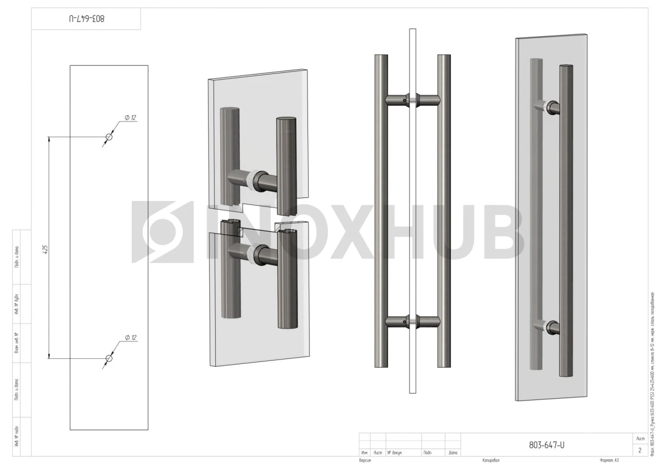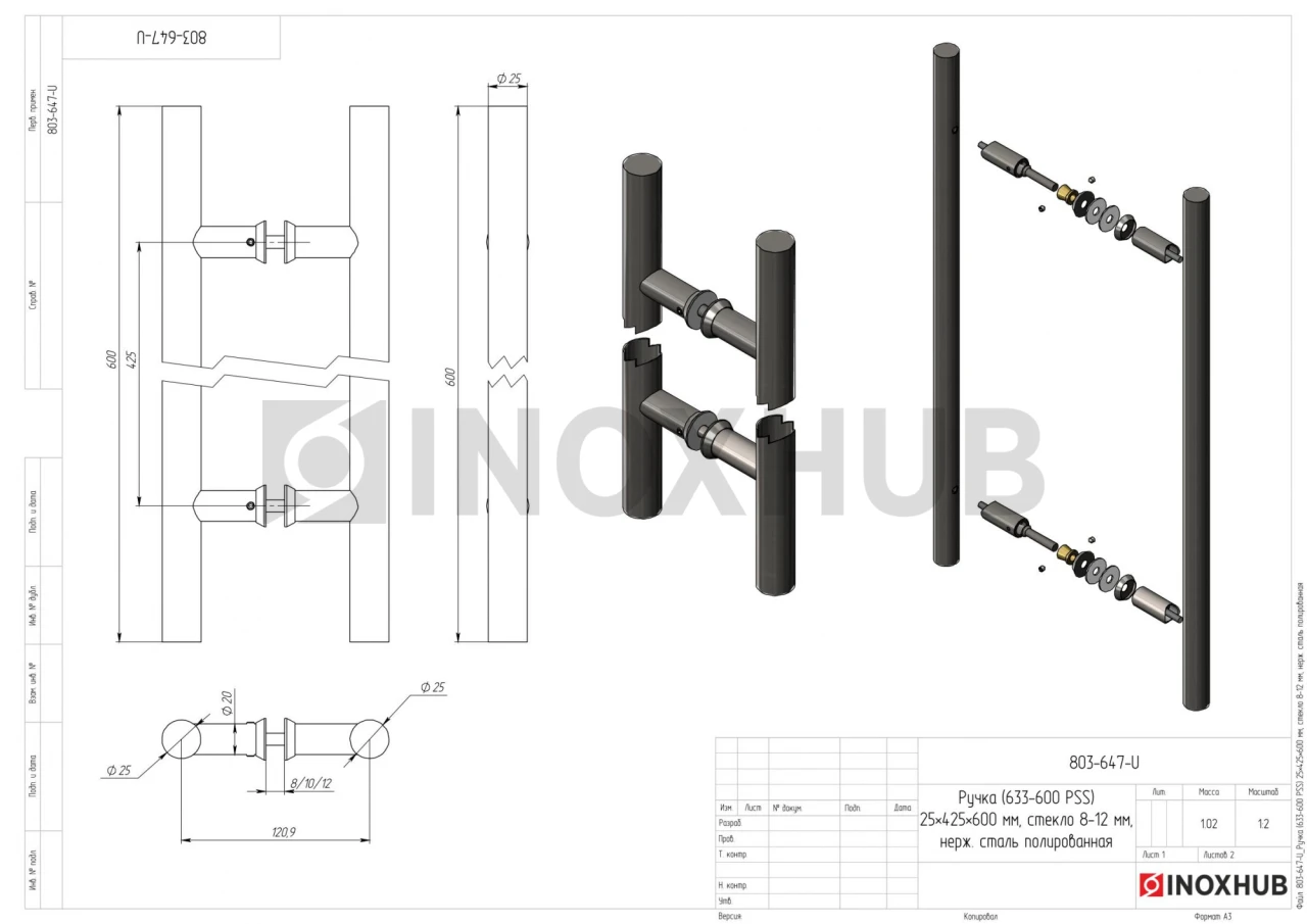 Ручка (633-600 PSS) 25×425×600 мм, стекло 8-12 мм, нерж. сталь полированная