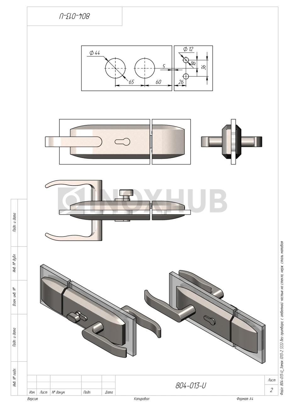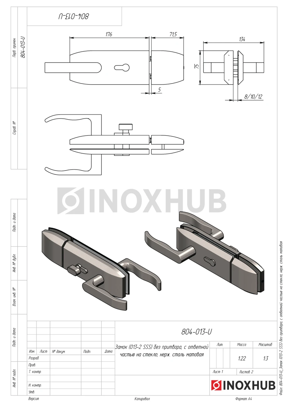 Замок (013-2 SSS) без притвора, с ответной частью на стекло, нерж. сталь матовая
