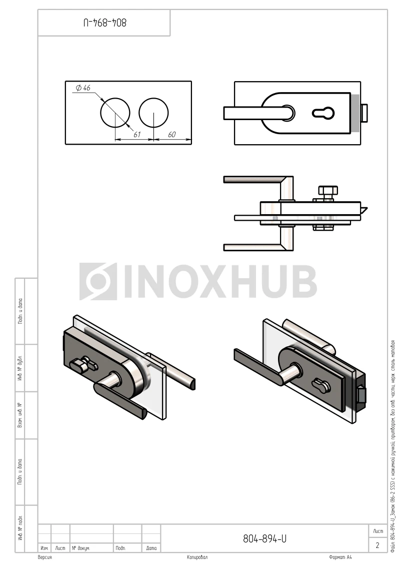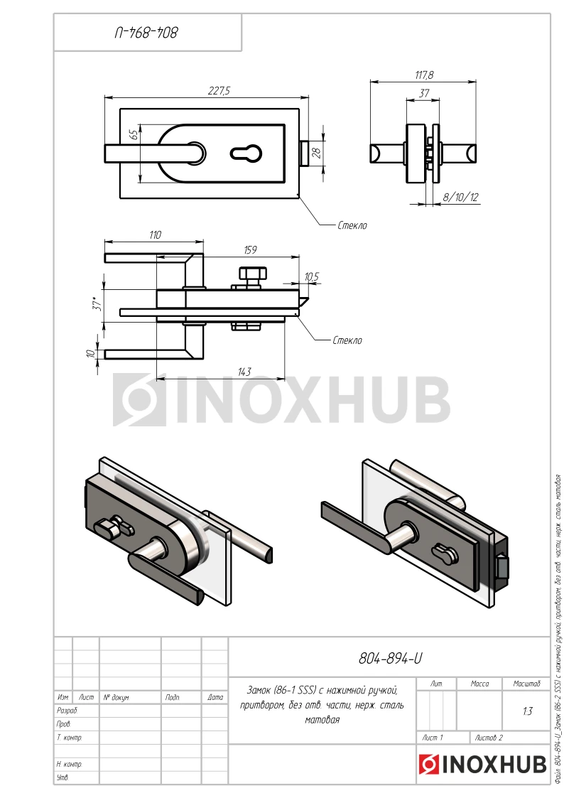 Замок (86-2 SSS) с нажимной ручкой, притвором, без отв. части, нерж. сталь матовая