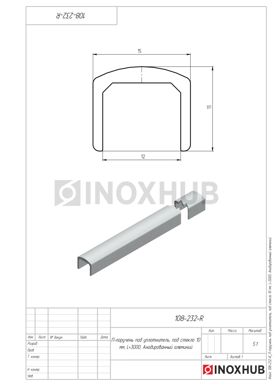 П-поручень под уплотнитель, под стекло 10 мм, L=3000, Анодированный алюминий в продаже. Оперативная доставка со склада в Москве. Все товары соответствуют стандартам качества.