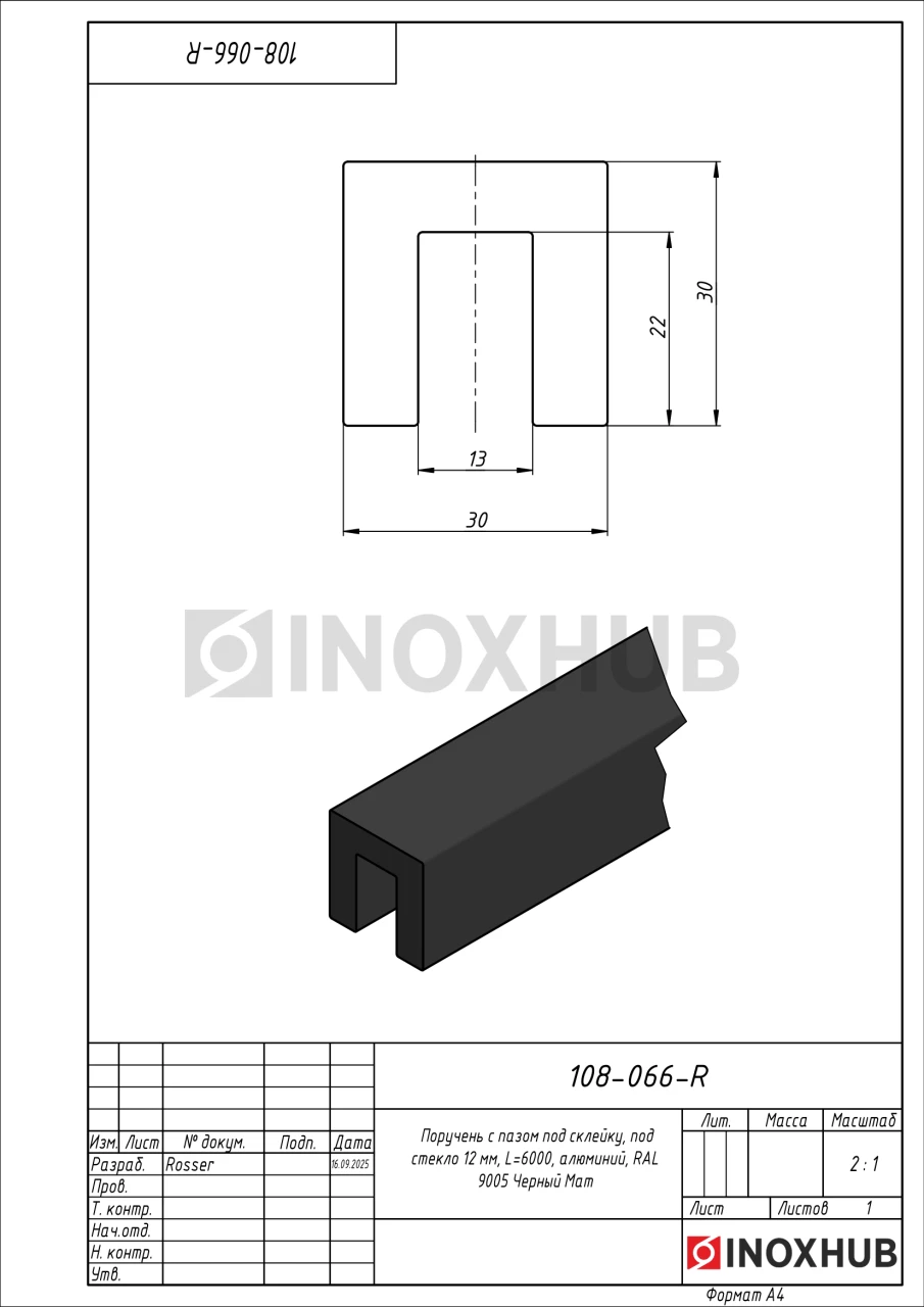 Поручень с пазом под склейку, под стекло 12 мм, L=4000, алюминий, RAL 9005 Черный Мат