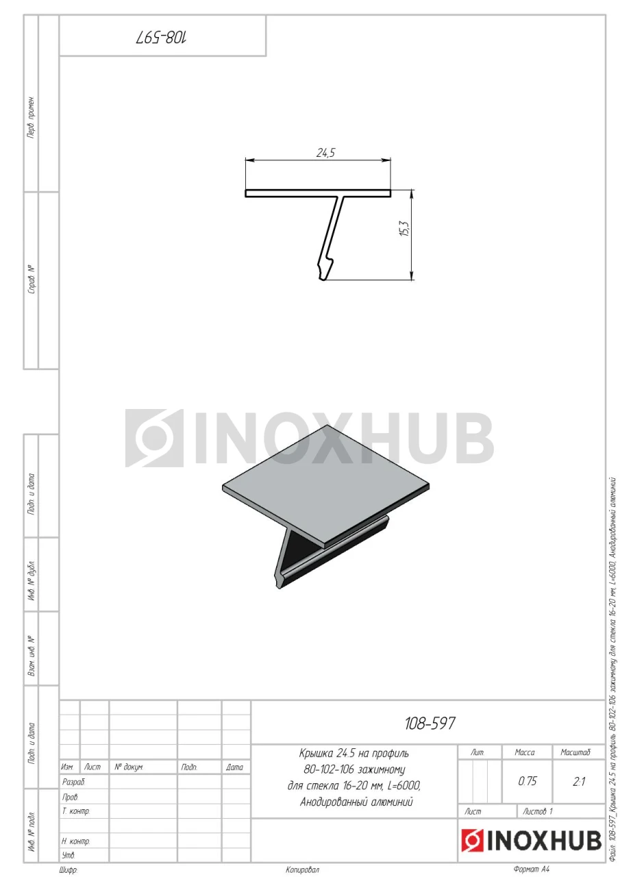 Крышка 24.5 на профиль 80/102/106 для стекла 16-20 мм, L=6000, Анодированный алюминий в продаже. Оперативная доставка со склада в Москве. Все товары соответствуют стандартам качества.