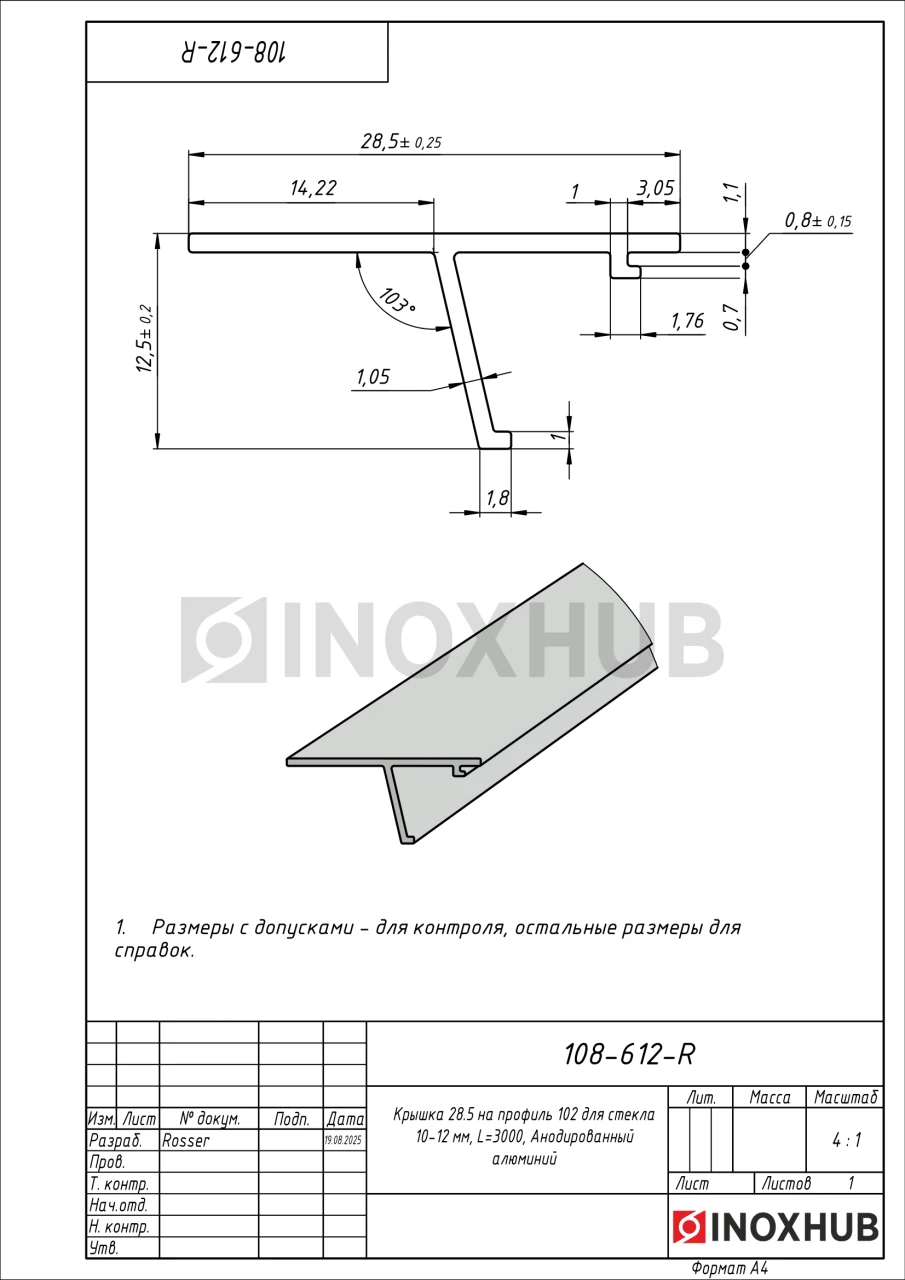 Крышка 28.5 на профиль 102 для стекла 10-12 мм, L=3000, Анодированный алюминий