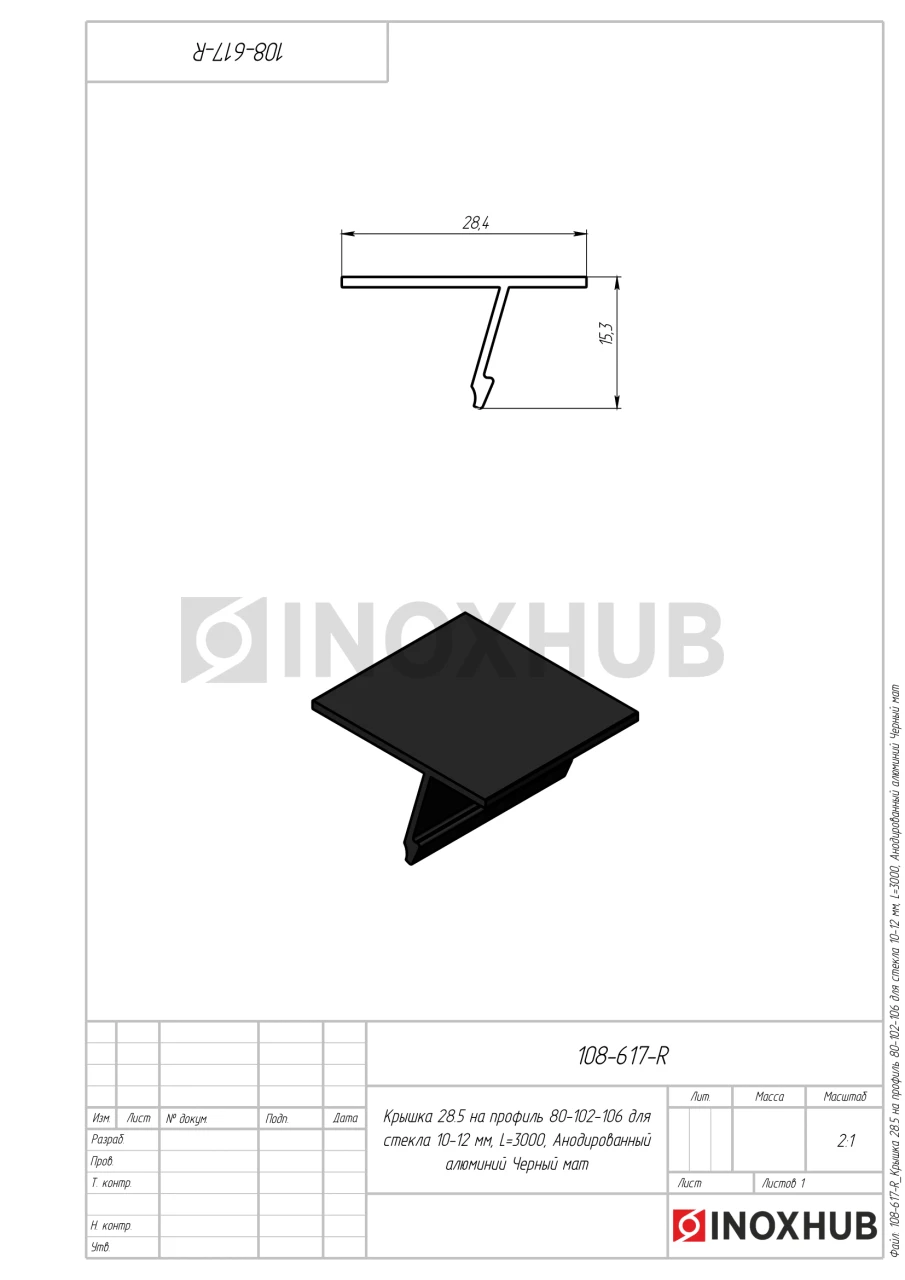 Крышка 28.5 на профиль 80/102/106 для стекла 10-12 мм, L=3000, Анодированный алюминий Черный мат в продаже. Оперативная доставка со склада в Москве. Все товары соответствуют стандартам качества.