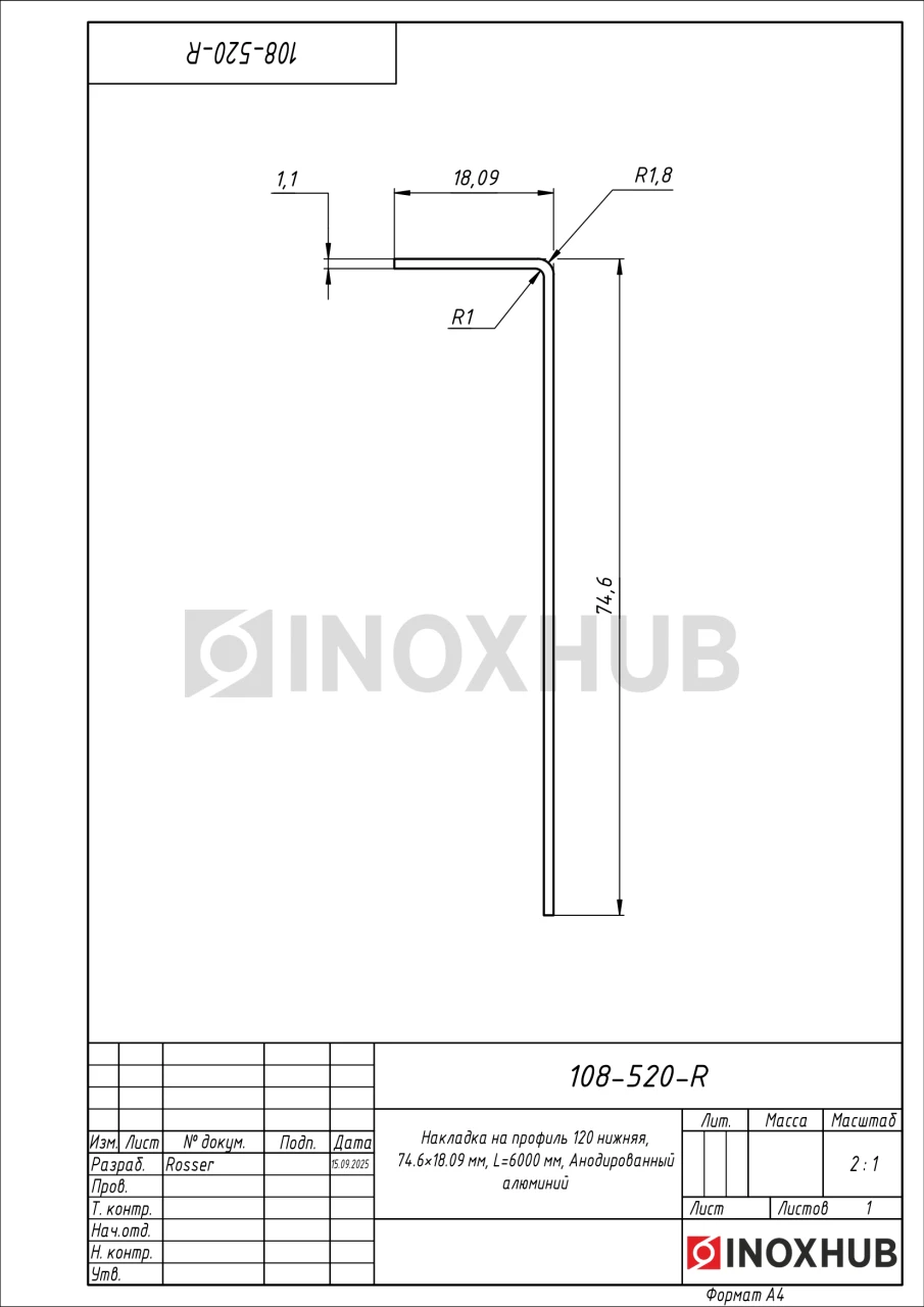 Накладка на профиль 120 нижняя, 74.6×18.09 мм, L=6000 мм, Анодированный алюминий в продаже. Оперативная доставка со склада в Москве. Все товары соответствуют стандартам качества.