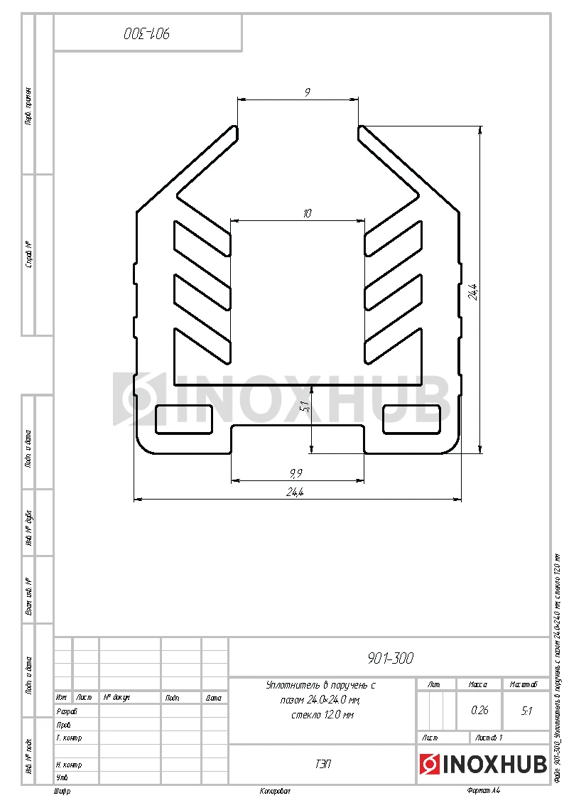 Уплотнитель в поручень с пазом 24.0×24.0 мм, стекло 12.0 мм, кратно 3 м