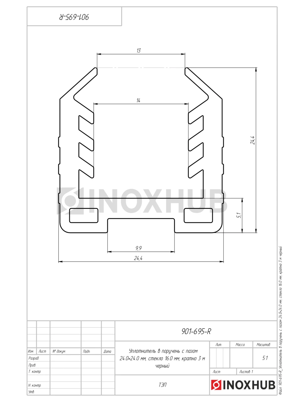 Уплотнитель в поручень с пазом 24.0×24.0 мм, стекло 16.0 мм, кратно 3 м, Черный
