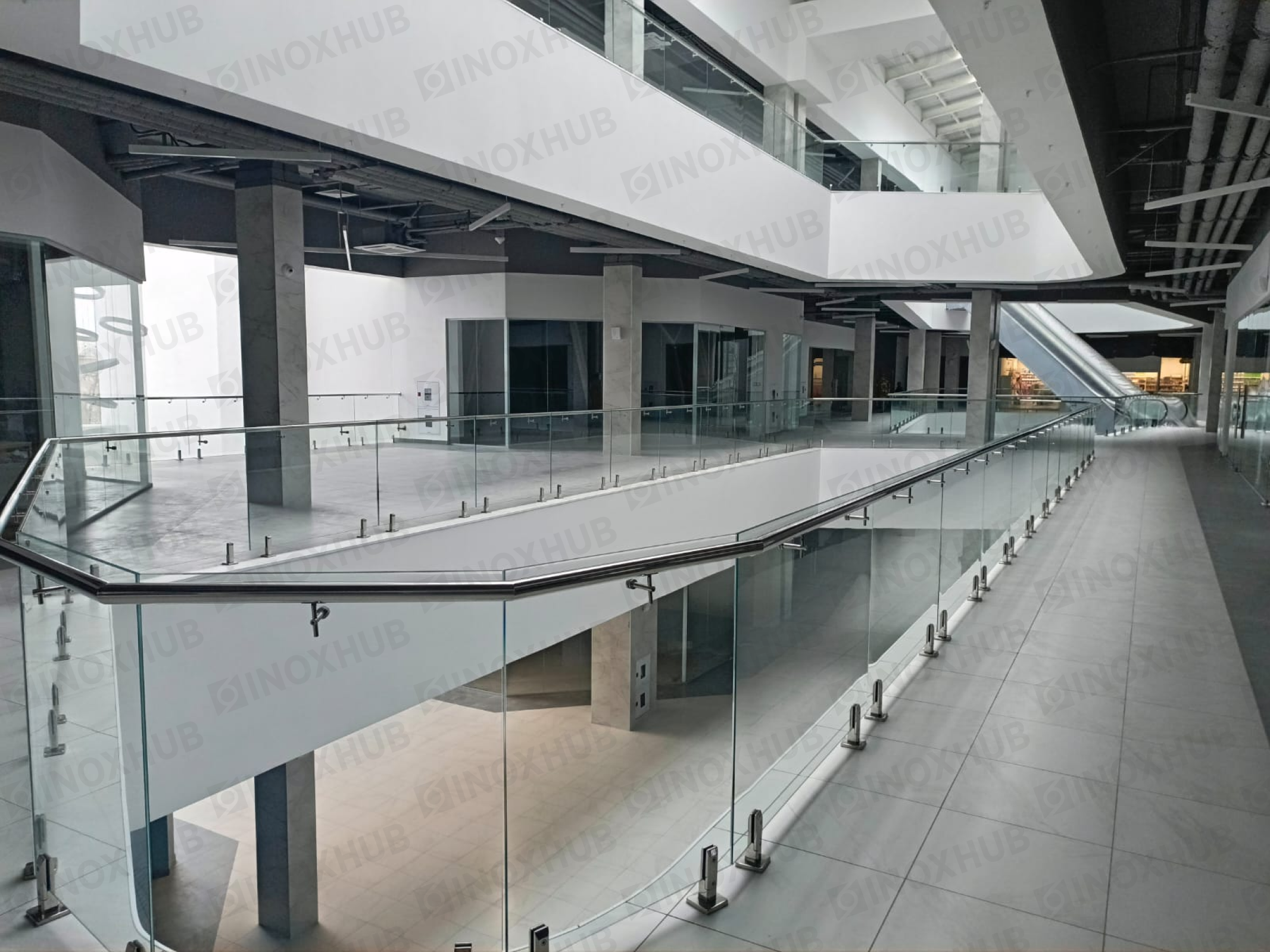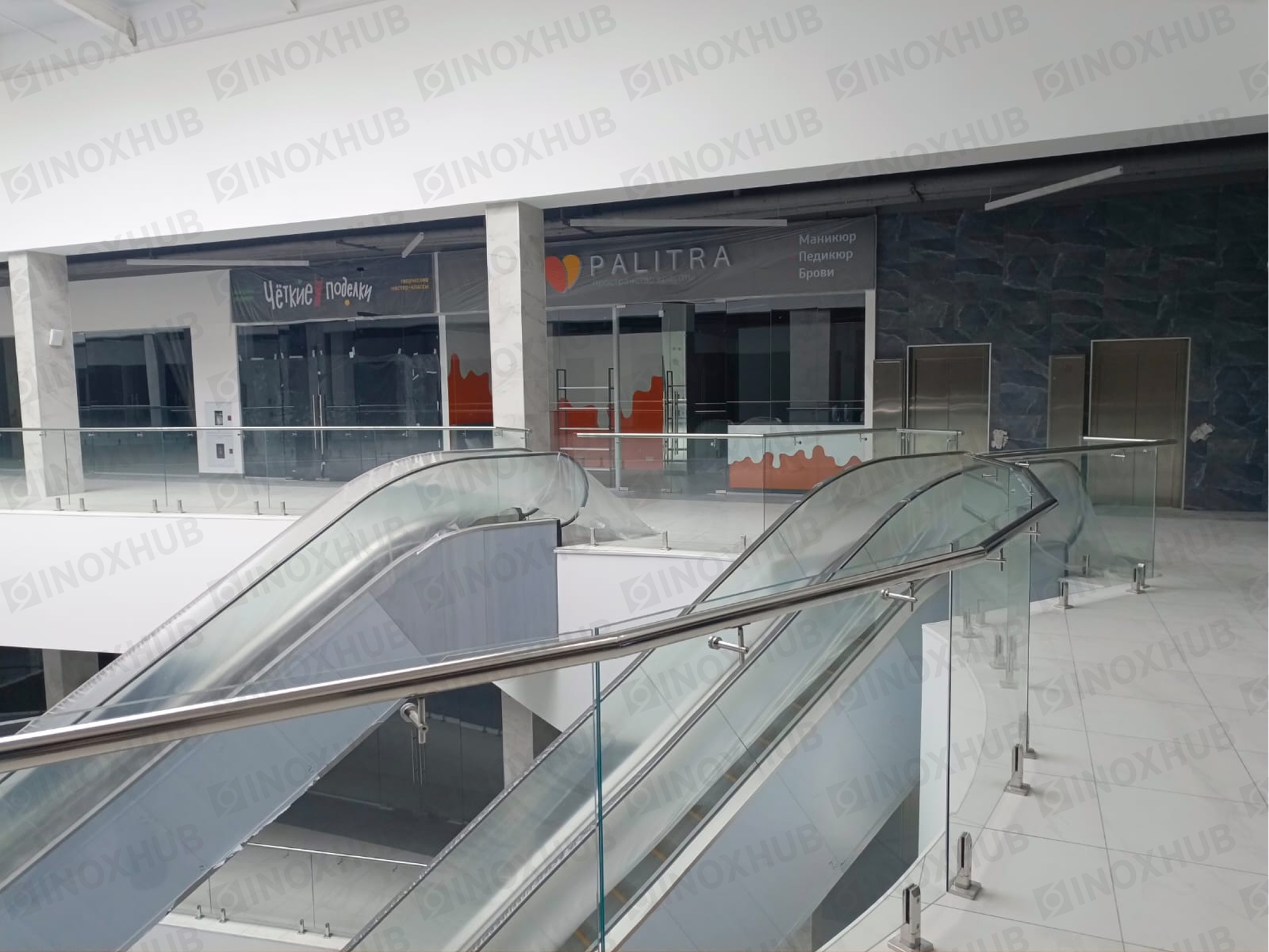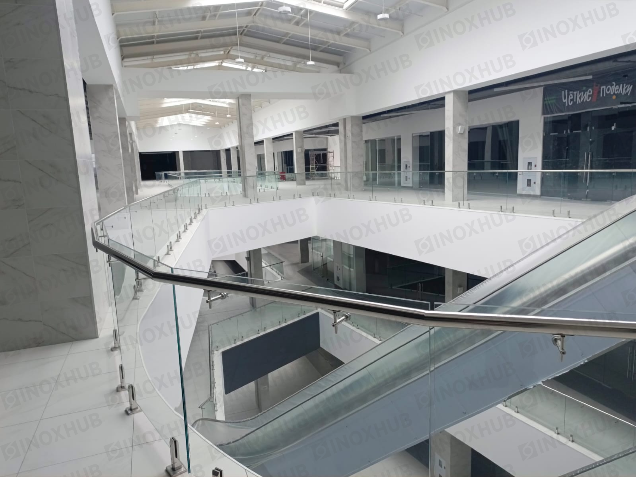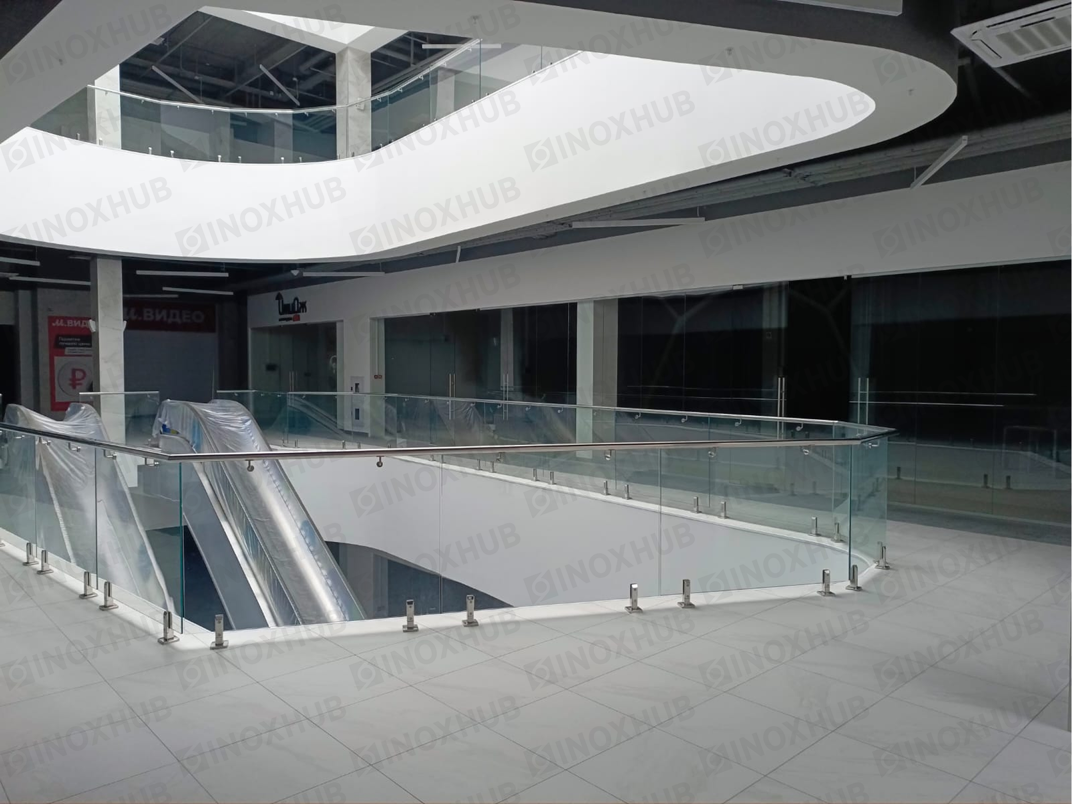 Сборка и монтаж стеклянных ограждений в ТЦ, с использованием премиальной перильной фурнитуры Inoxhub. Листайте дальше, чтобы увидеть все работы с использованием нашей фурнитуры, а также товары, задействованные в работе