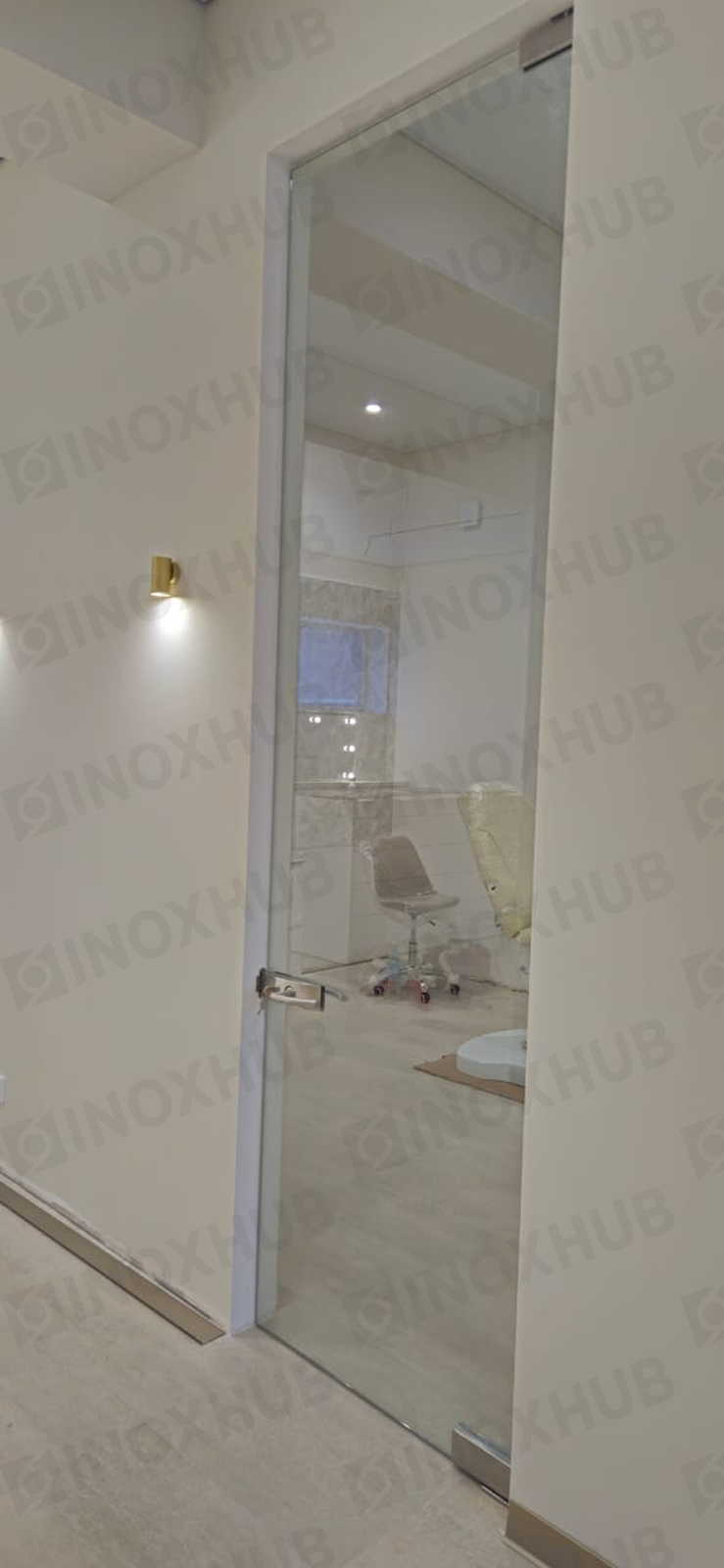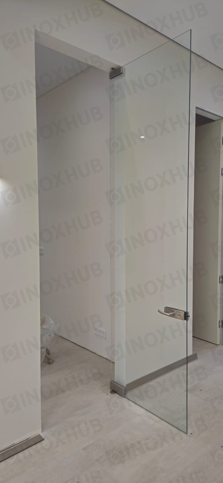 Монтаж офисных дверей из стекла с использованием высококачественной фурнитуры для стекла Inoxhub. Листайте дальше, чтобы увидеть все работы с использованием нашей фурнитуры, а также товары, задействованные в работе